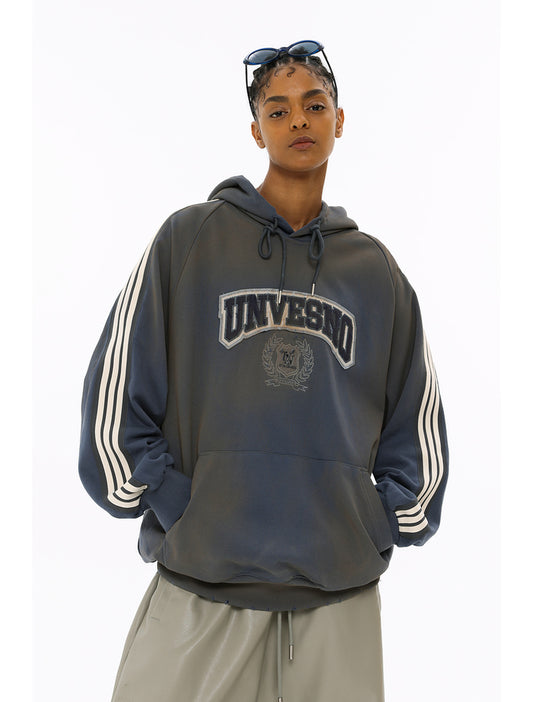 Distressed Dirty Fit Patch Embroidery Small Hole Hooded Sweatshirt