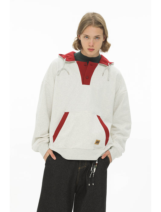 Retro contrast color stitching POLO hooded velvet sweatshirt