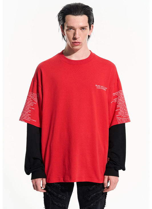 Contrast Color Faux Two Piece Letter Print Pullover Loose Long Sleeve Tee