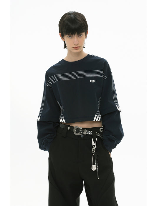 Embroidery Striped Faux Two Piece Round Neck Couple Long Sleeve T-Shirt