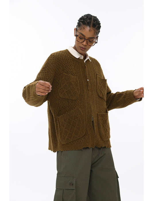Mohair Knit Double Slider Pocket Twist Cardigan Sweater