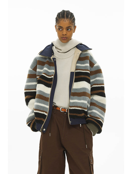 Retro Short Striped Sherpa Hooded Retro Work Jacket