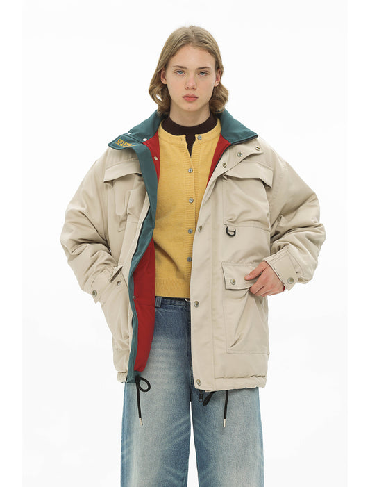 Retro contrast color stitching POLO hooded velvet sweatshirt