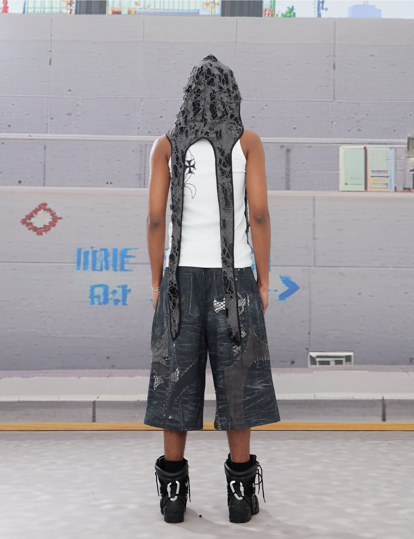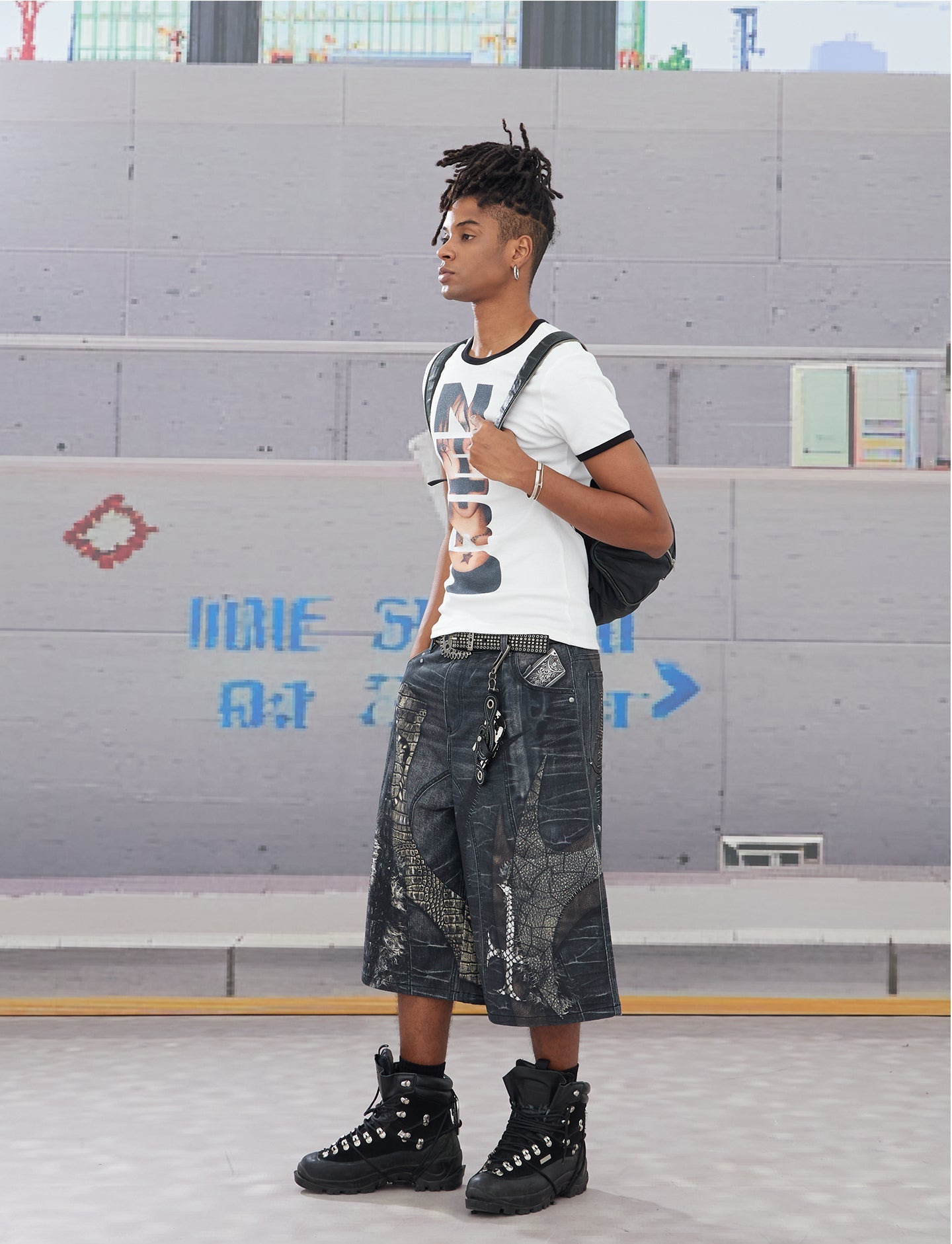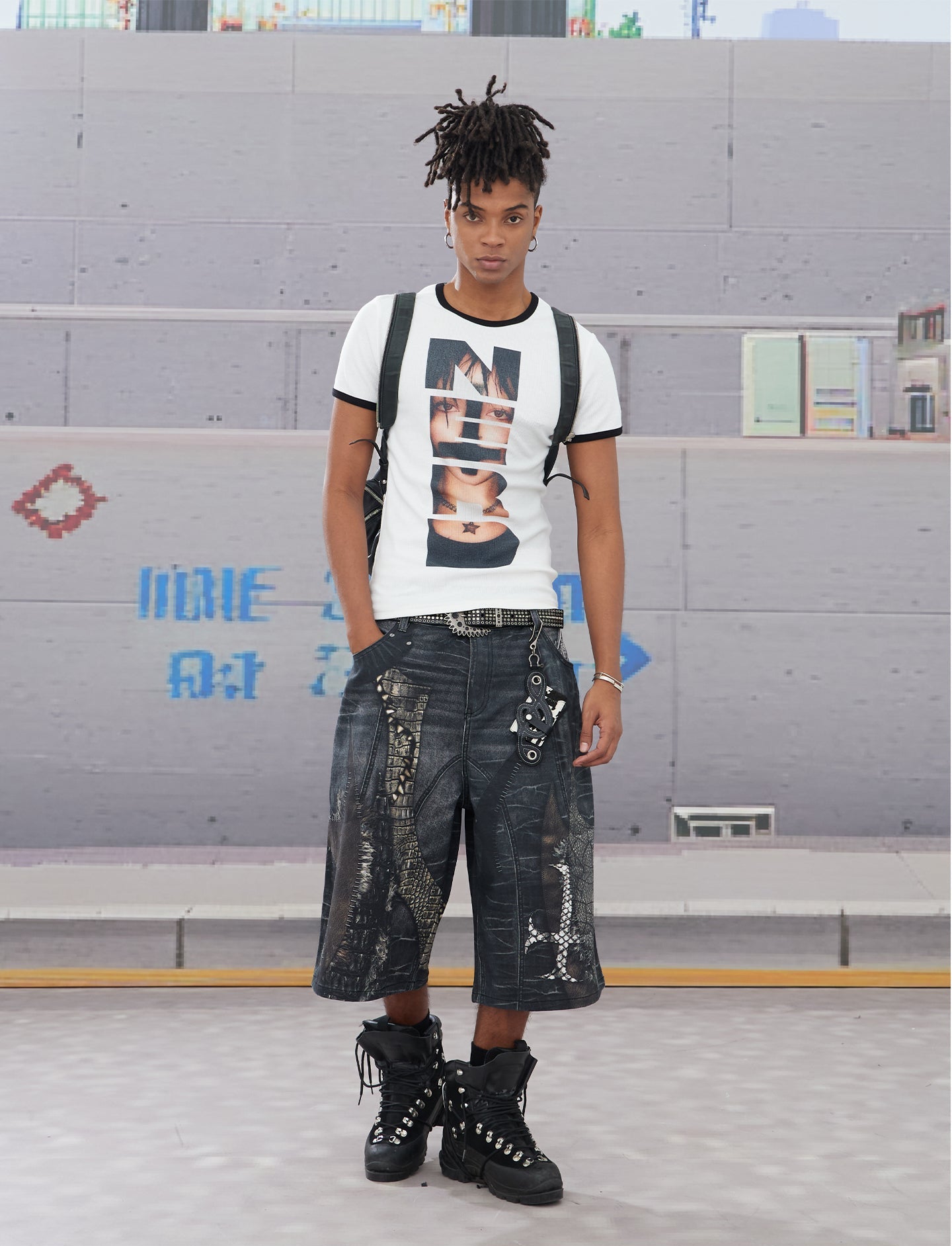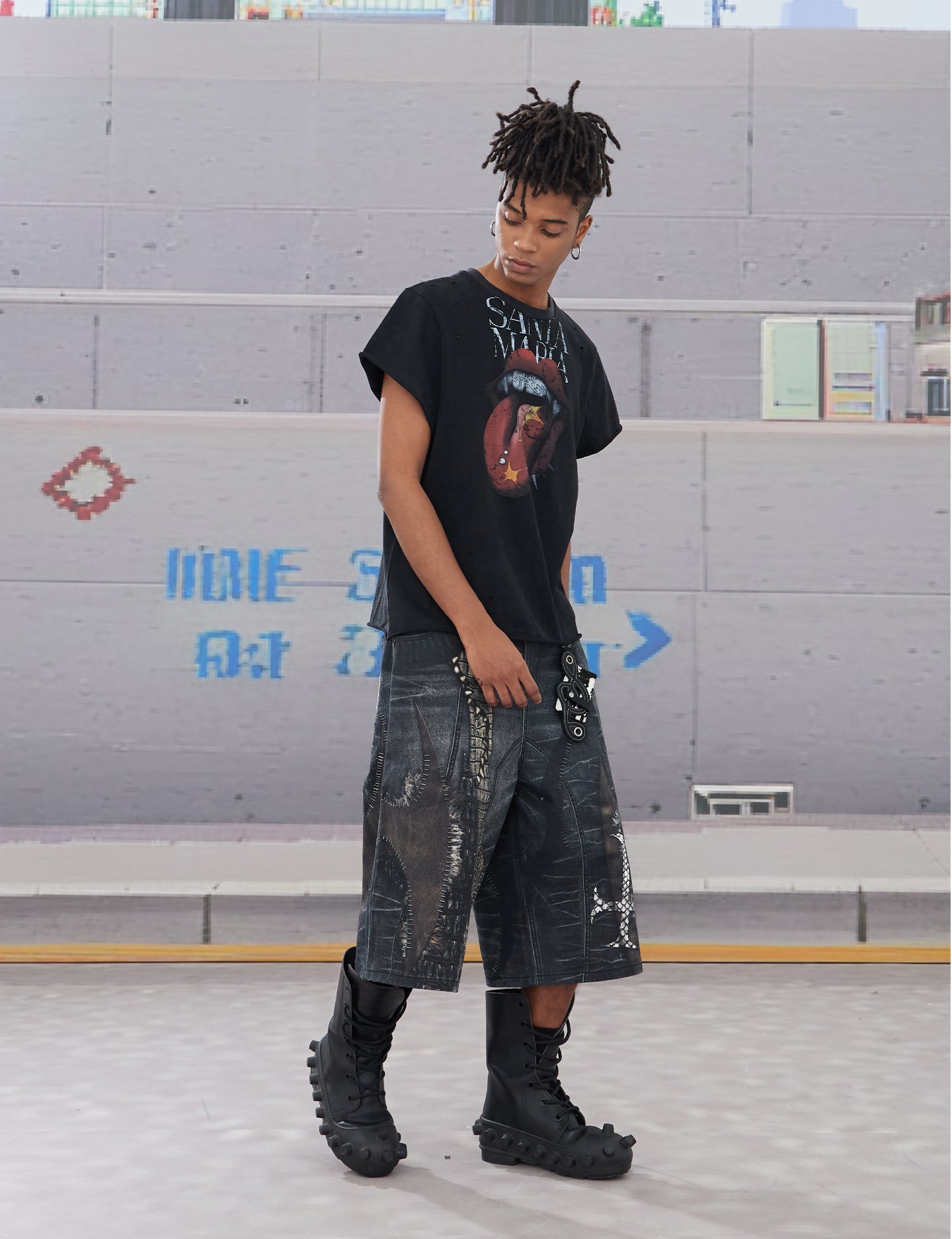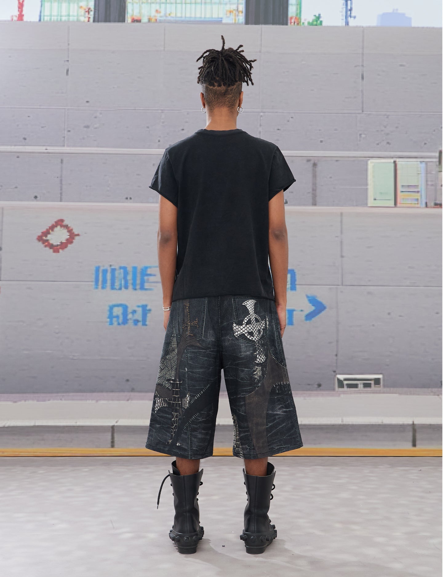 Splicing Digital Print Denim Shorts