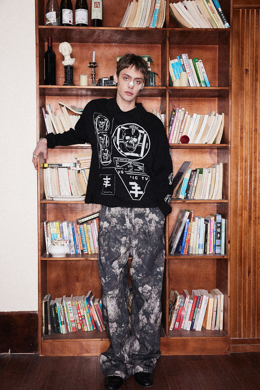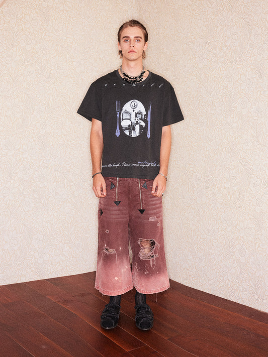 Printed Washed Damaged Hoodie