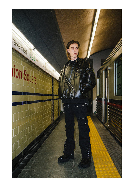 Imitation leather shiny pleated nylon multi-pocket twist zipper jacket