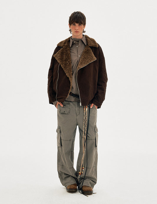 Diagonal Zipper Lambswool Collar Cotton Jacket