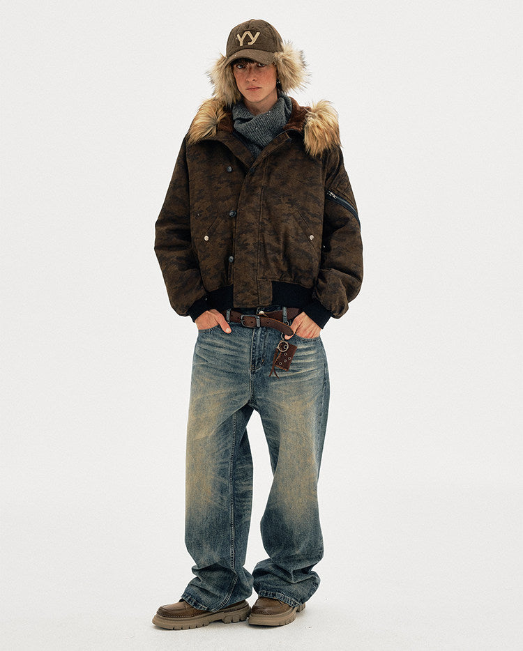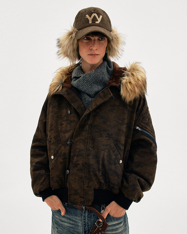 Distressed finish camouflage fur-collar jacket