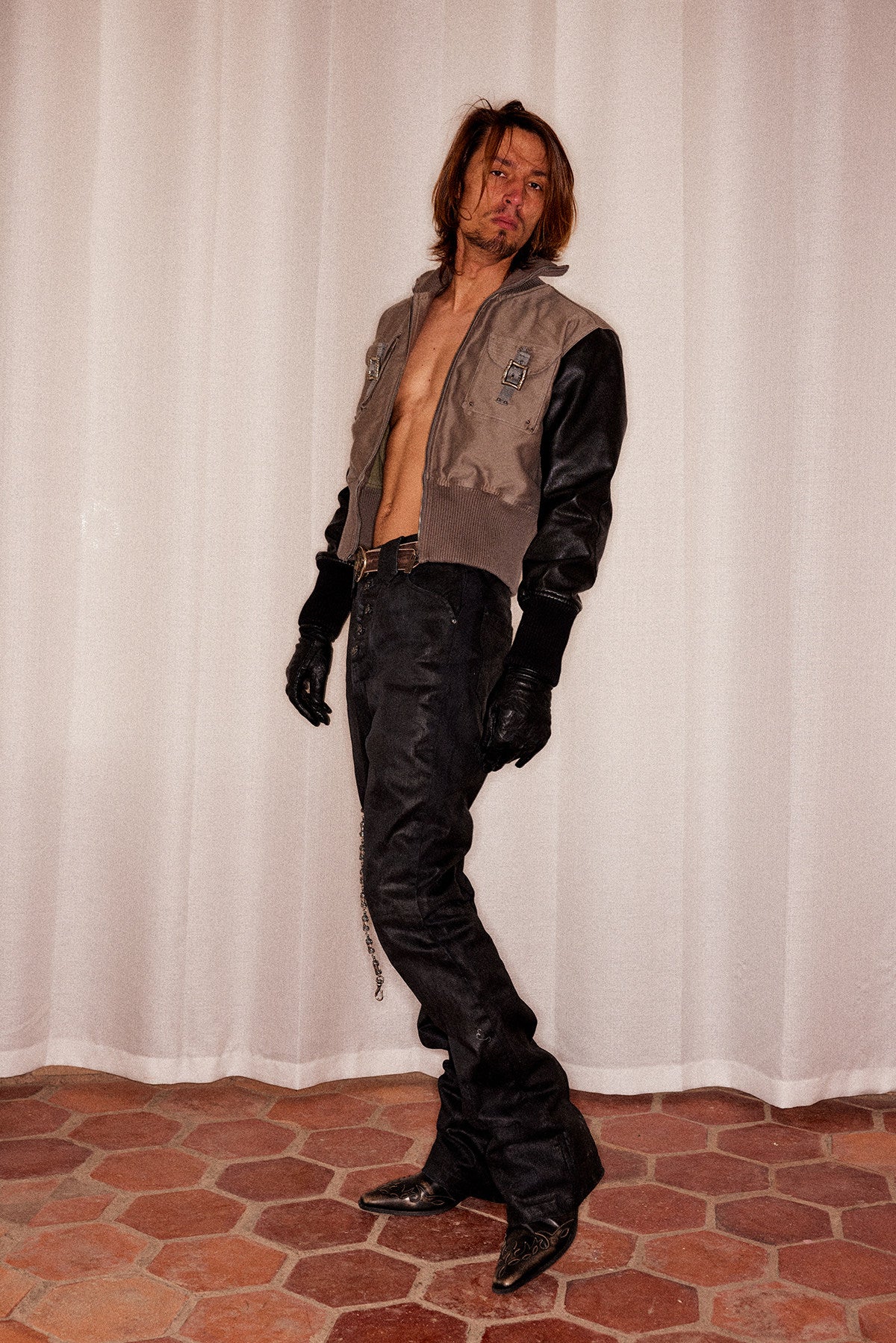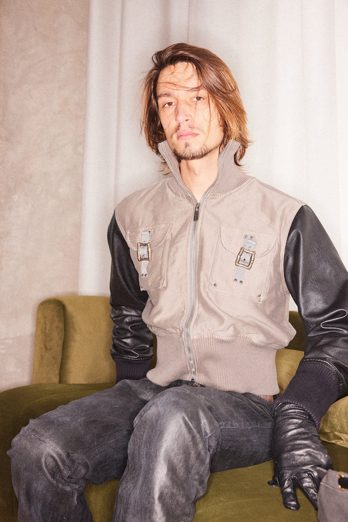 Double-Pocket Ribbed Leather Sleeve Jacket