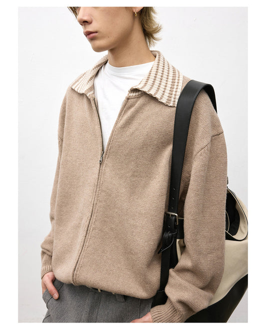 Color Block Lapel Zipper Sweater