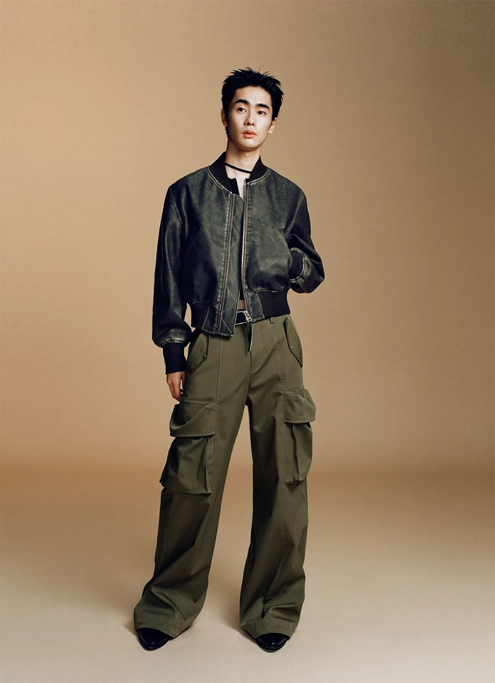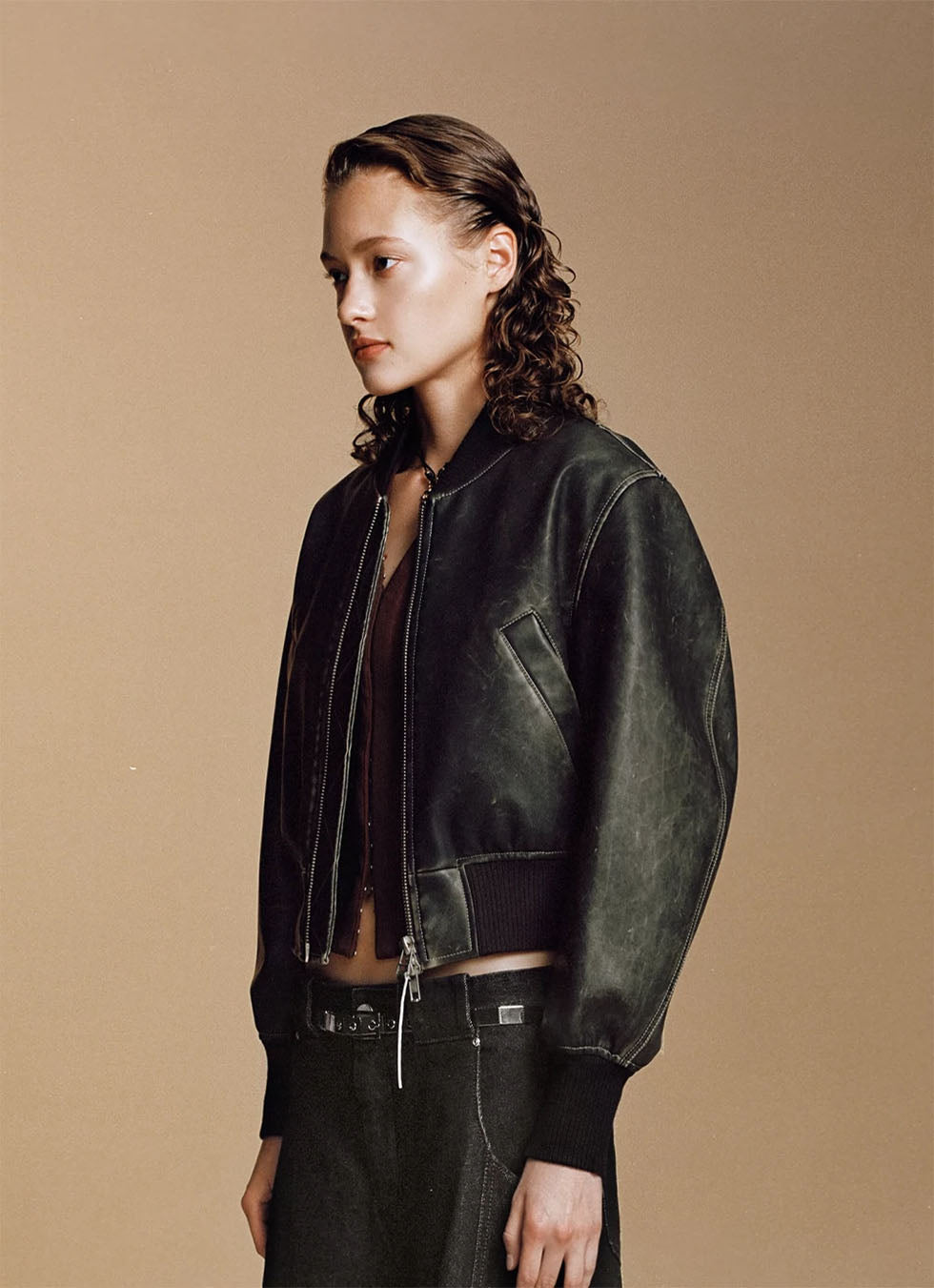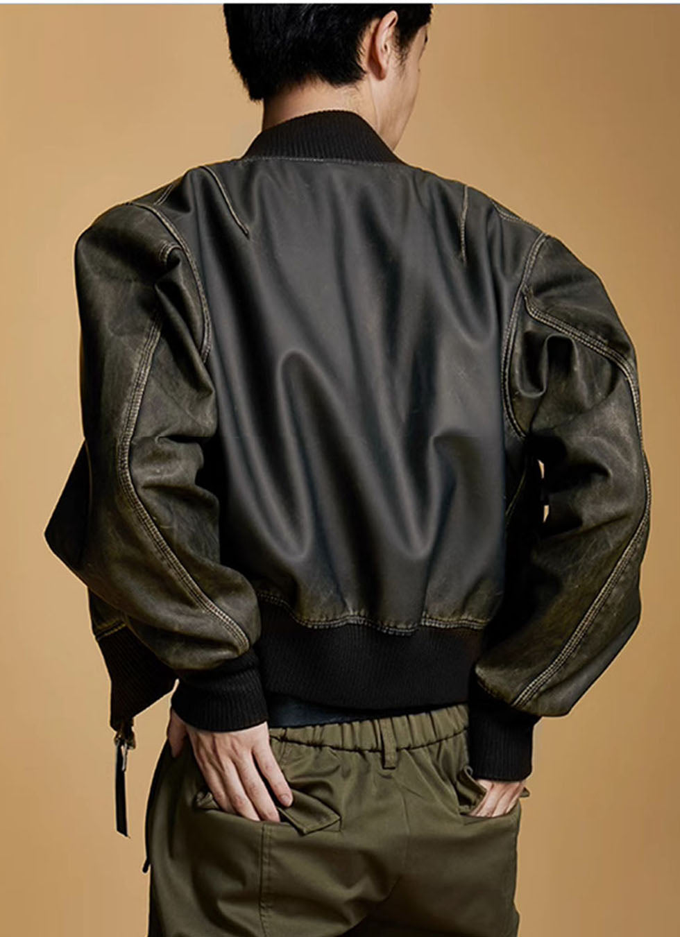 Washed bomber leather short flight jacket
