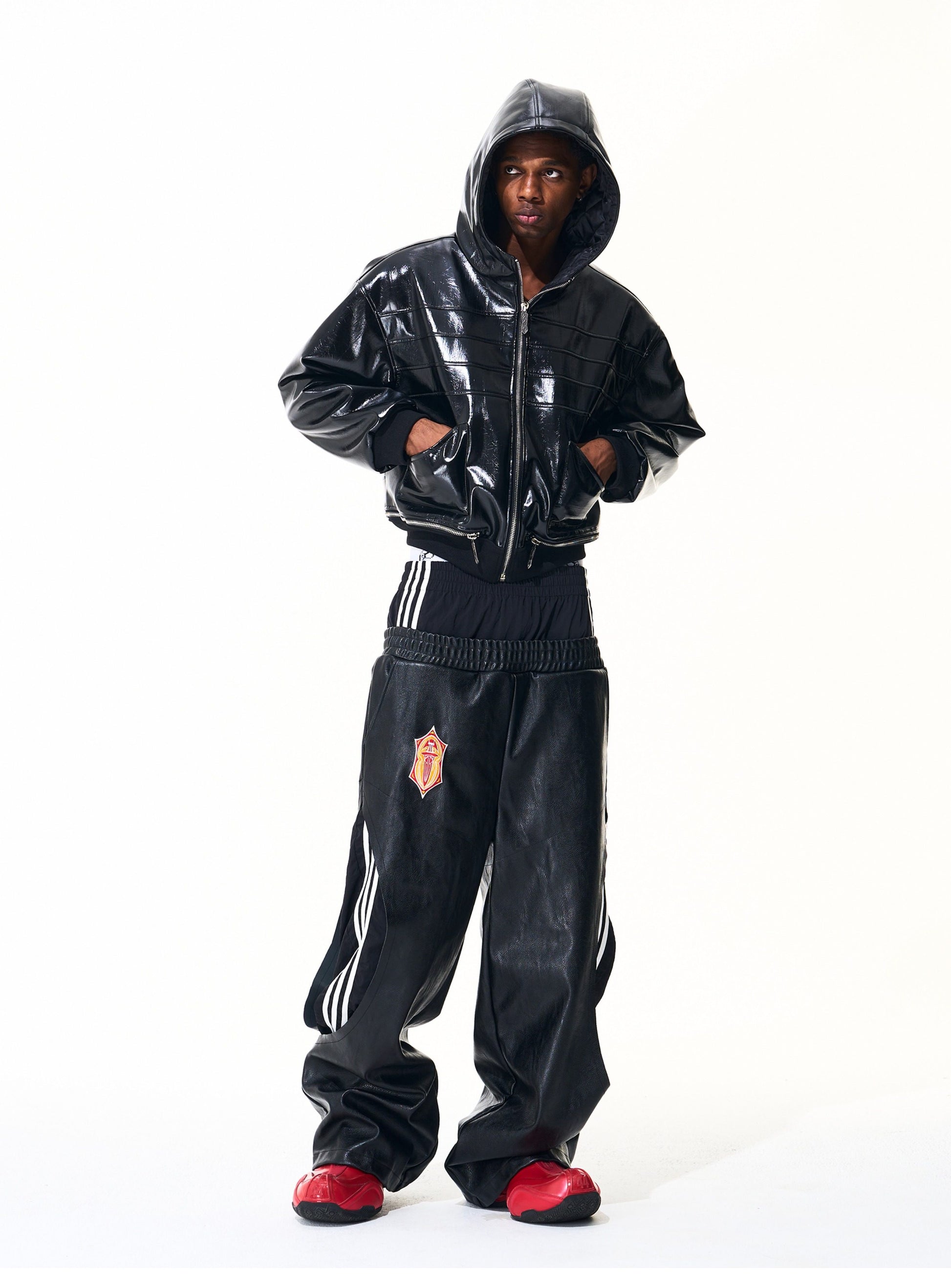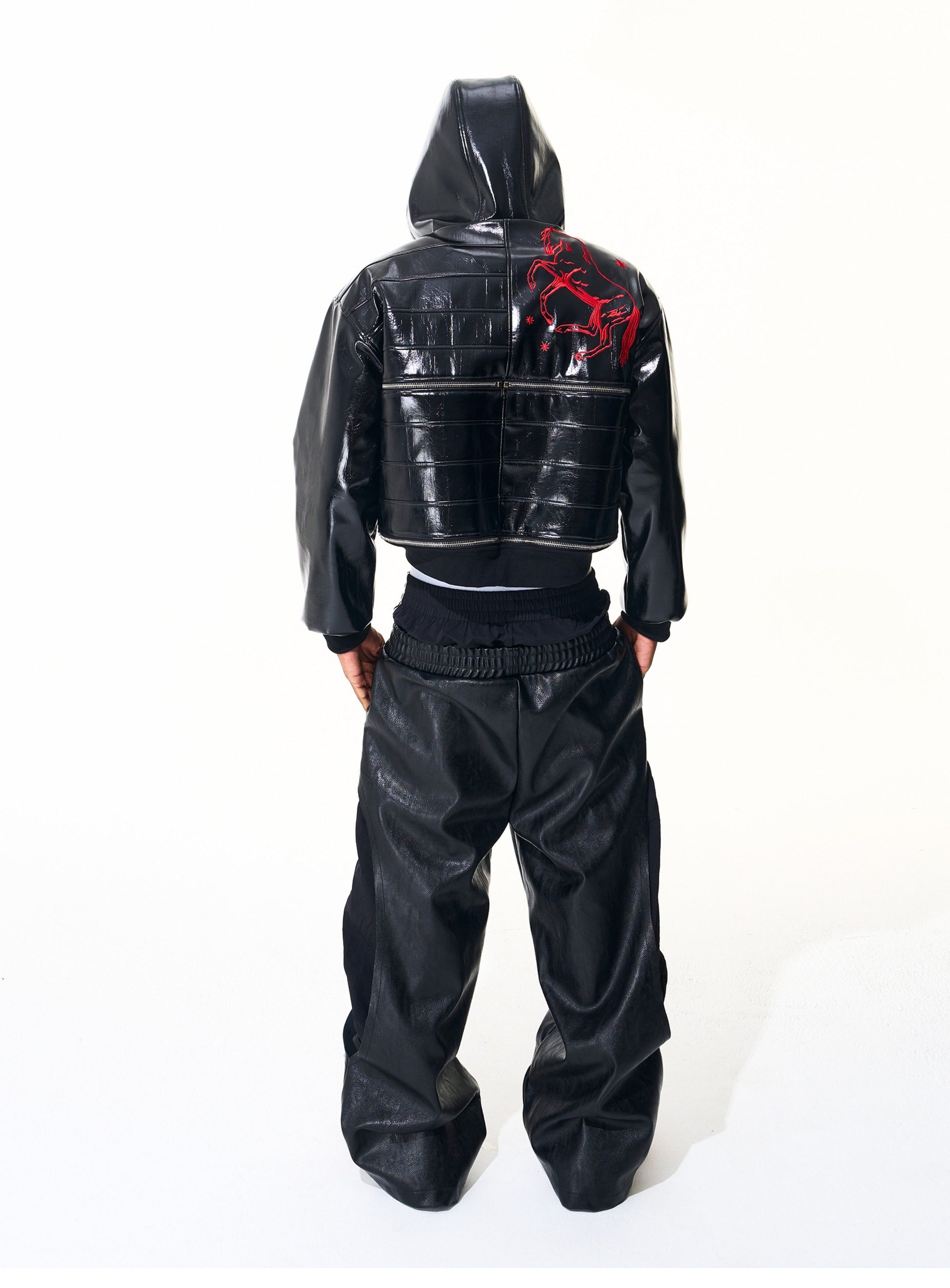 Striped Double-Waist Leather Pants
