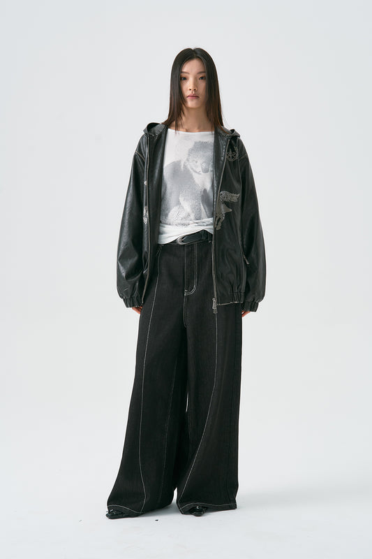 Sequin Embroidery Mid Length Faux Leather Jacket
