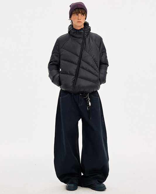 Diagonal Zipper Hooded Lightweight Down Jacket
