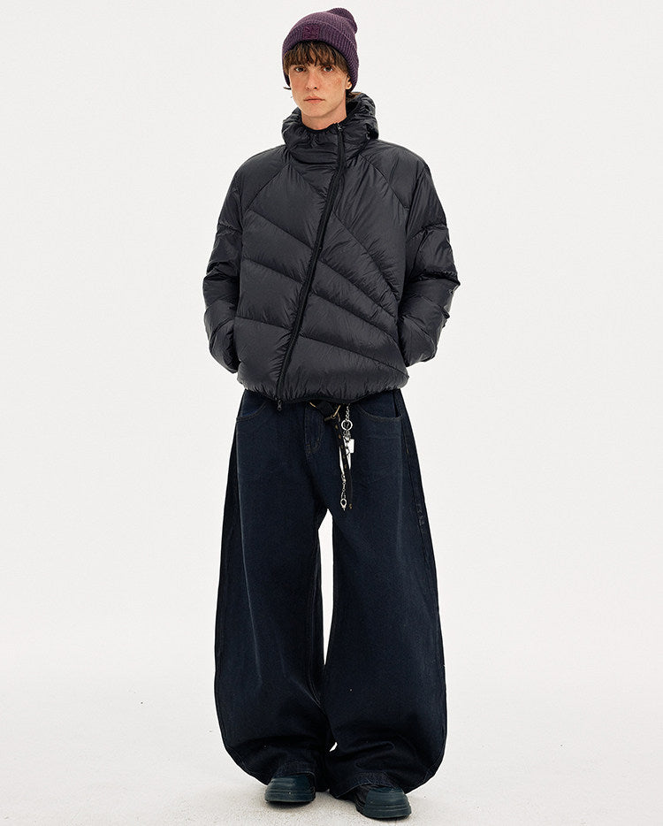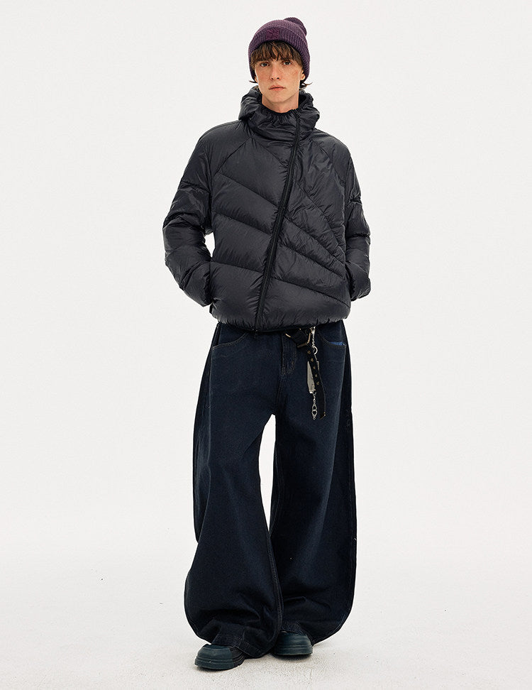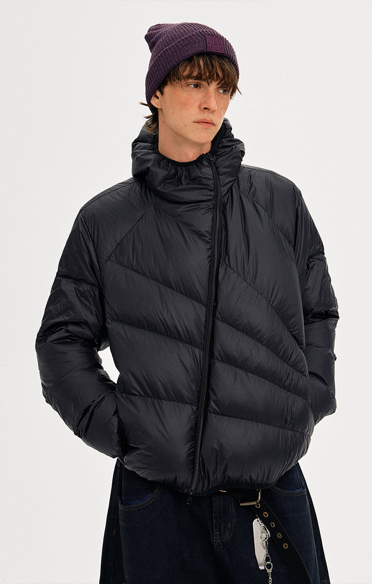 Diagonal Zipper Hooded Lightweight Down Jacket