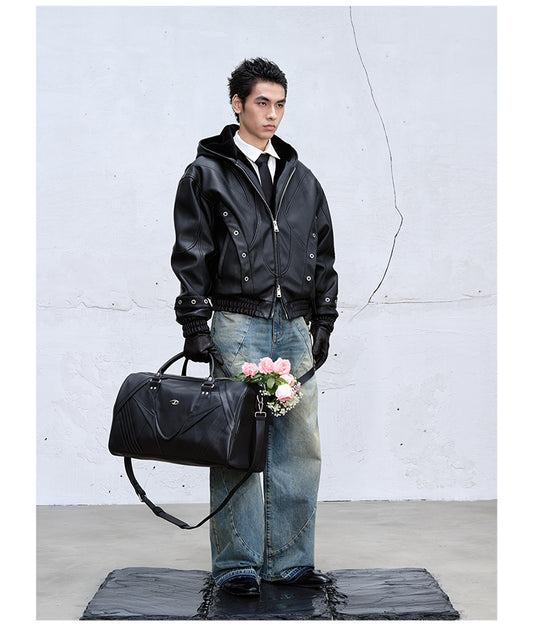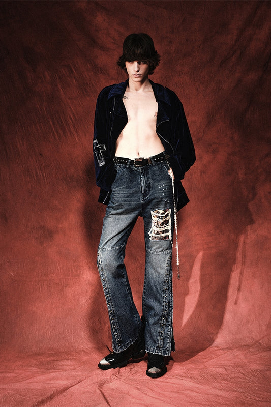 Retro Rivet Washed Damaged Zipper Jeans