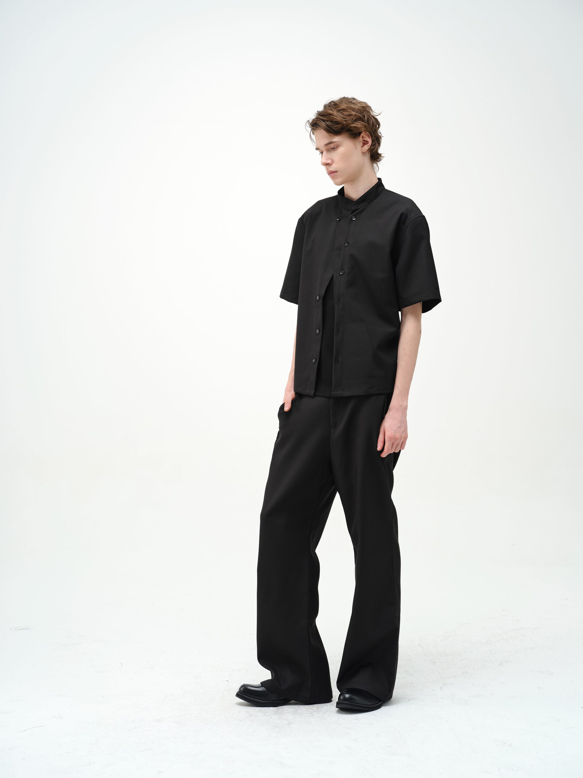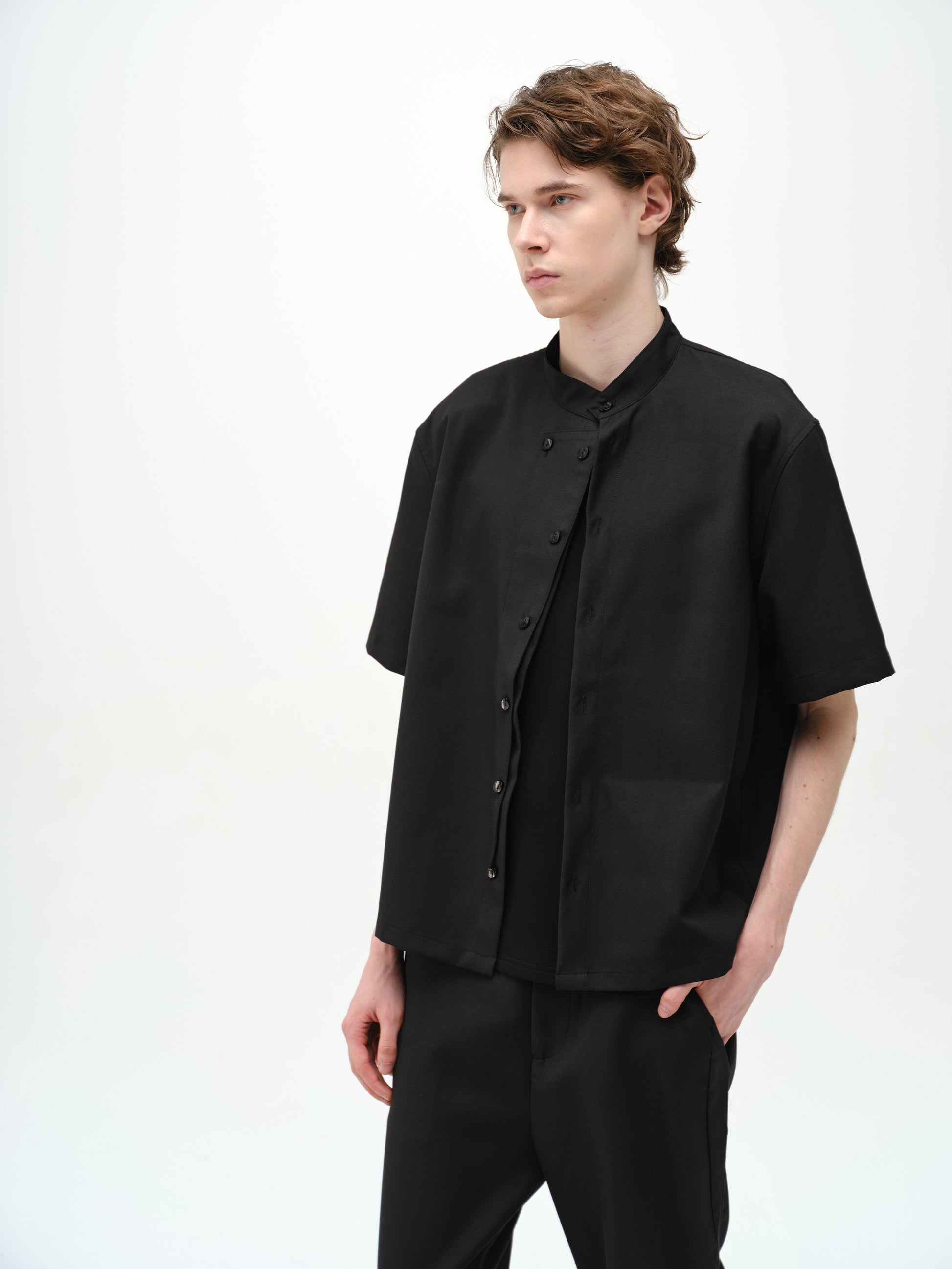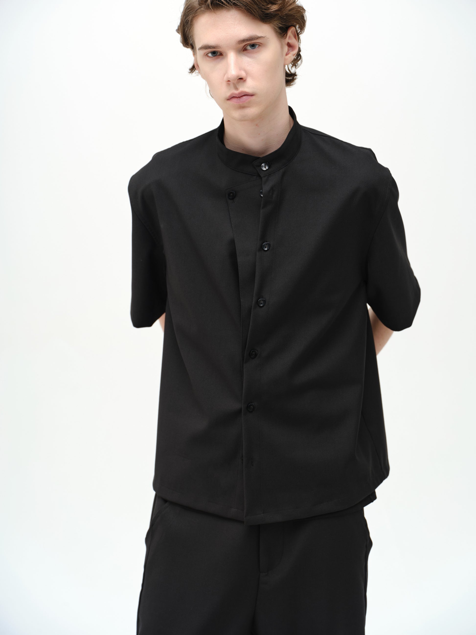 스탠드 칼라 이중 여밈 셔츠