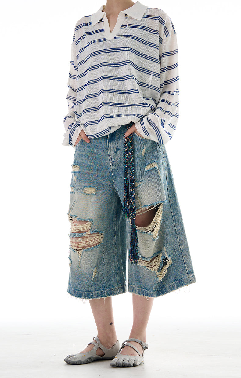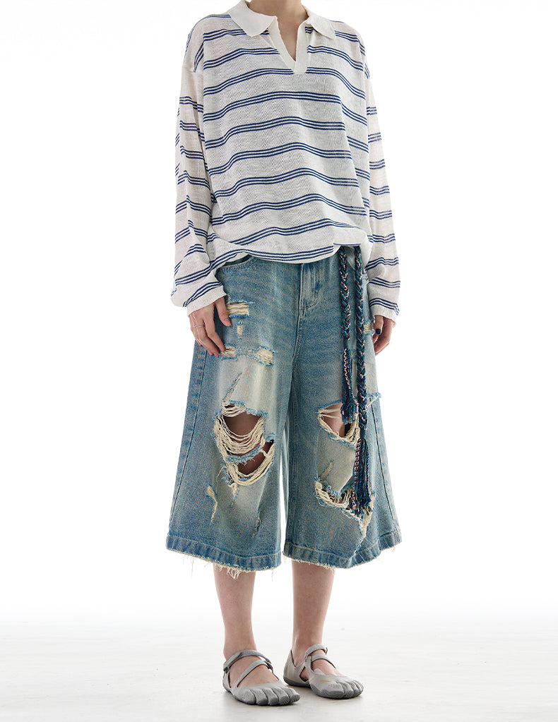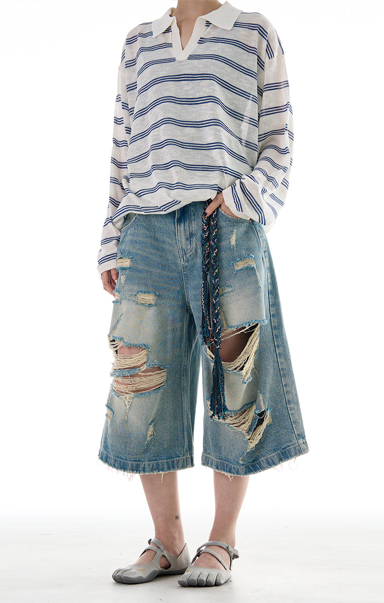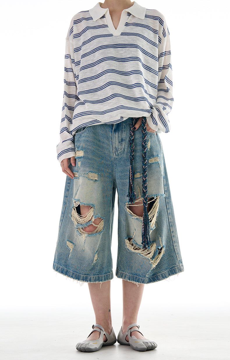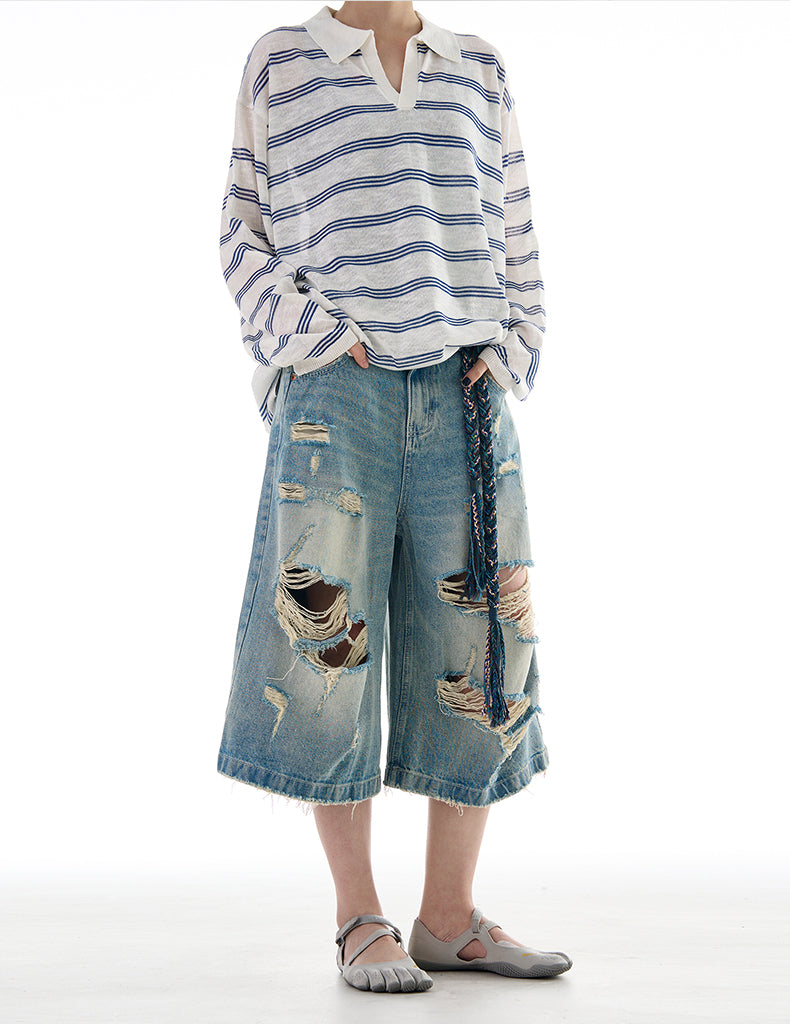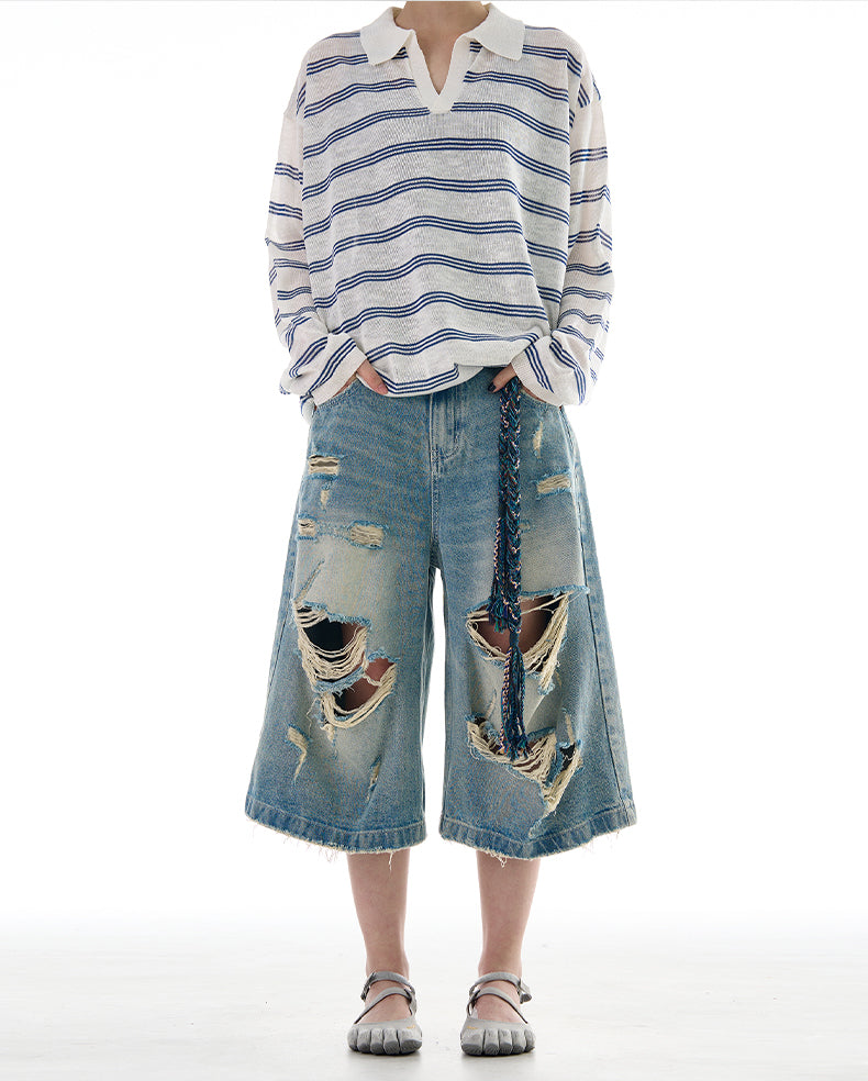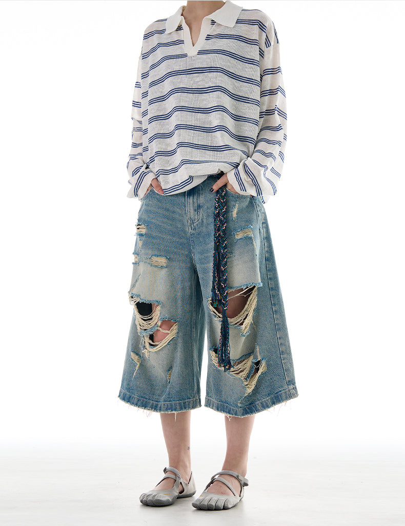 Wide Leg Damaged Cropped Shorts